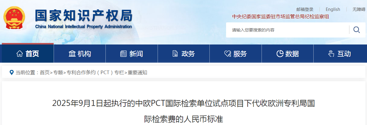 根据《关于中欧PCT国际检索单位试点项目以人民币代收欧洲专利局国际检索费的通知》,国家知识产权局自2025年9月1日起执行的中欧PCT国际检索单位试点项目下代收欧洲专利局国际检索费的人民币标准发生变化,现将相关事项通知如下。