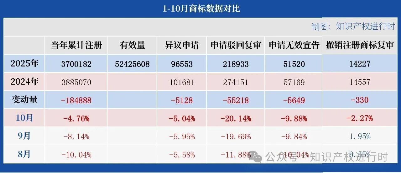 2025年1-10月商标注册量相比2024年商标注册量减少18.4888万件(同比下降4.76%)。申请无效宣告同比下降9.88%,申请驳回复审同比下降20.14%,申请撤销注册商标复审同比下降2.27%。