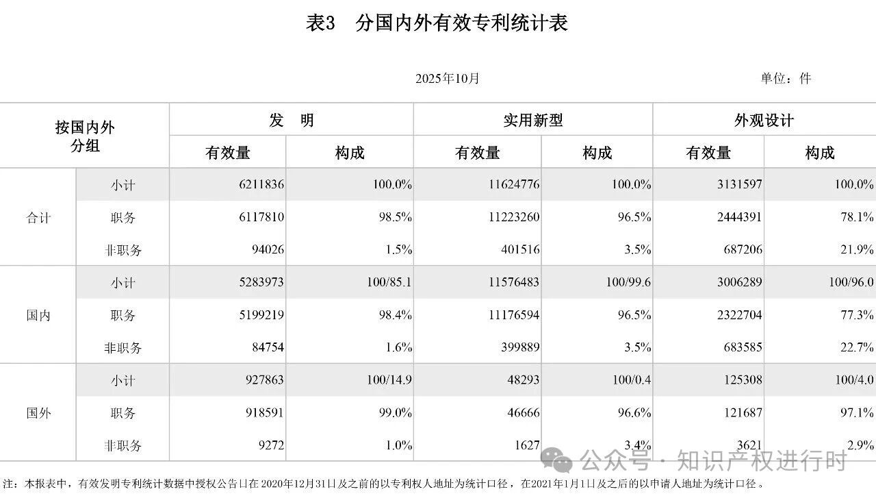 截至2025年10月,三类专利总有效量达2096.8209万件。