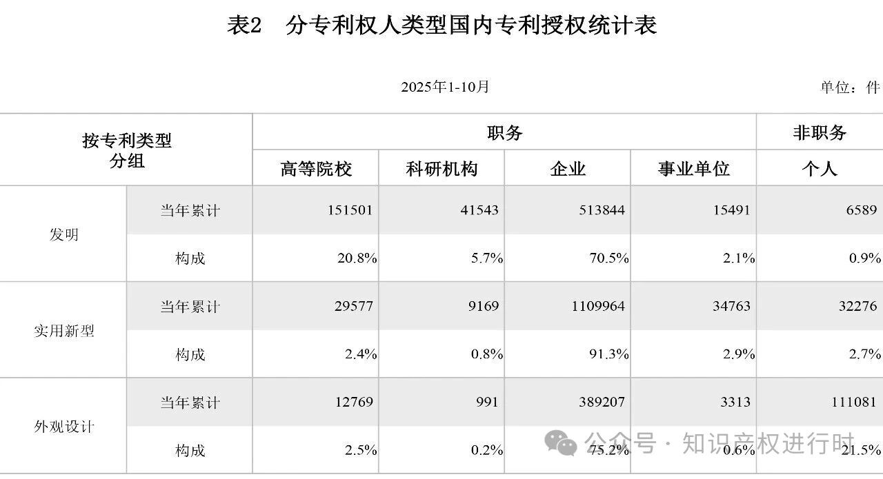 2025年1-10月专利授权量同比减少51.9万件,发明授权量同比下降11.4%,实用新型授权量同比下降26%,个人下降55%