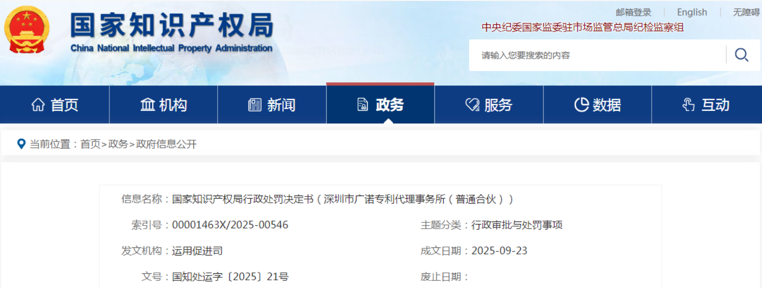 当事人以上行为属于《专利代理管理办法》第五十一条第(二)项、第(四)项、第(八)项、第(九)项所列的违法情形,构成《专利代理条例》第二十五条第一款第(五)项规定的“疏于管理,造成严重后果”的违法行为,且多种违法情形并存,情节严重。根据《专利代理条例》第二十五条第一款的规定,综合考虑当事人违法行为事实、性质、情节,现决定作出处罚如下:吊销深圳市广诺专利代理事务所(普通合伙)专利代理机构执业许可证。当事人上述行为属于《市场监督管理严重违法失信名单管理办法》第九条第(二)项规定的“从事严重违法专利、商标代理行为”,根据《市场监督管理严重违法失信名单管理办法》第二条、第十二条相关规定,决定将当事人列入市场监督管理严重违法失信名单,通过国家企业信用信息公示系统公示,并实施相应管理措施。列入期限自2025年9月23日起至2028年9月22日。期满一年后,当事人可依据《市场监督管理严重违法失信名单管理办法》第十六条、第十七条规定向我局申请提前移出严重违法失信名单,停止公示相关信息并解除相应管理措施。