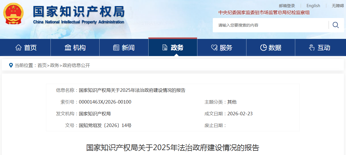 国家知识产权局关于2025年法治政府建设情况的报告