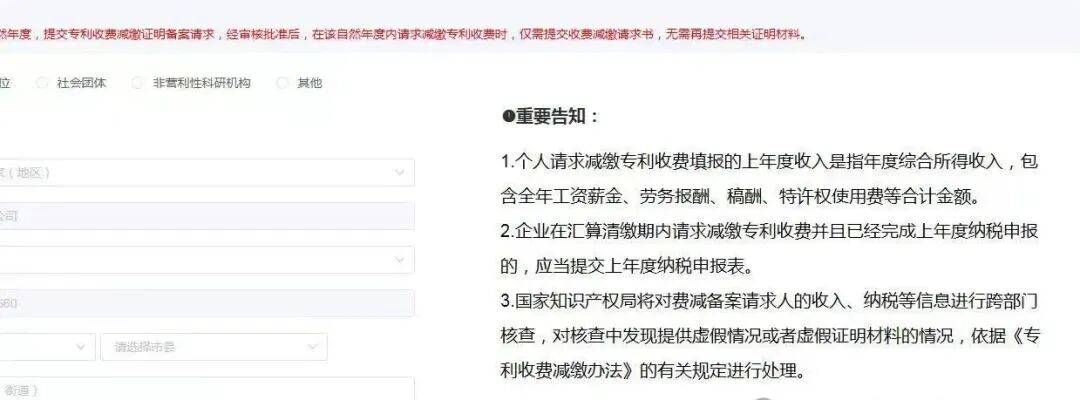 专利费减备案系统界面有所变化,在费减系统页面右侧出现了告知事项:个人请求减缴专利收费填报的上年度收入是指年度综合所得收入,包含全年工资薪金、劳务报酬、稿酬、特许权使用费等合计金额。企业在汇算清缴期内请求减缴专利收费并且已经完成上年度纳税申报:的,应当提交上年度纳税申报表。国家知识产权局将对费减备案请求人的收入、纳税等信息进行跨部门核查,对核查中发现提供虚假情况或者虚假证明材料的情况,依据《专利收费减缴办法》的有关规定进行处理。