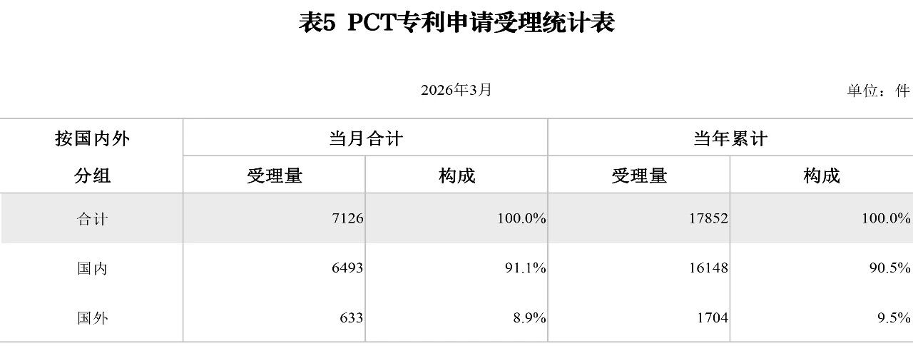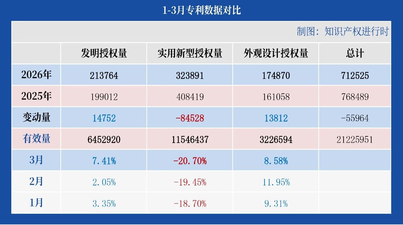 国家知识产权局网站公布2026年3月的知识产权主要统计数据;与2025年同期对比: