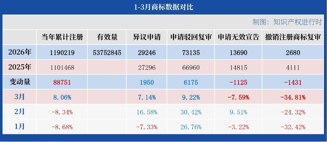 2026年1-3月商标注册量相比2025年商标注册量增加88751件(同比上升8.06%)。申请无效宣告同比下降7.59%,申请驳回复审同比上升9.22%,申请撤销注册商标复审同比下降34.81%。