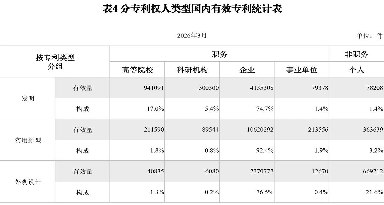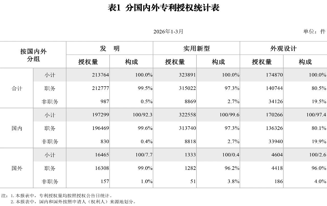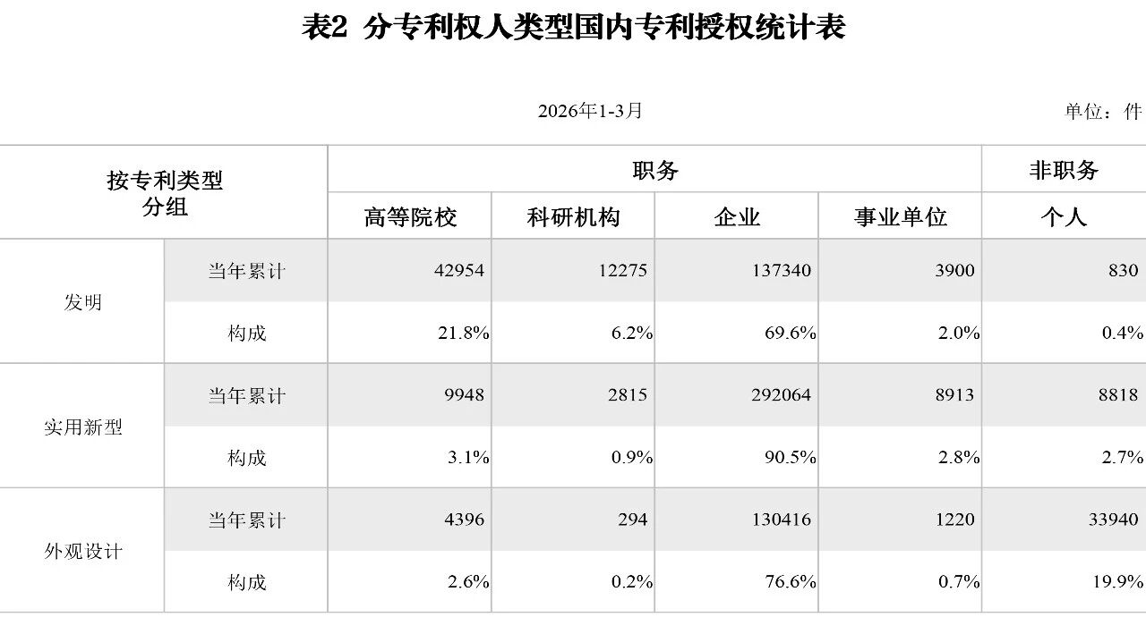 2026年1-3月发明专利授权量同比增长7.4%,个人发明授权量下降70%;实用新型授权量同比下降20.7%(减少8.4万件),个人下降35%