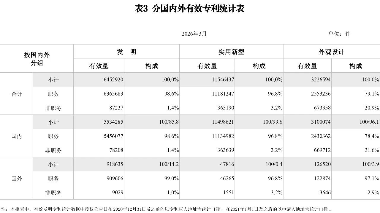 截至2026年3月,三类专利总有效量达2122.5951万件。